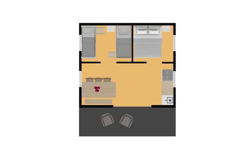 Tent. The tent has outdoor furniture. The unit has 3 beds.