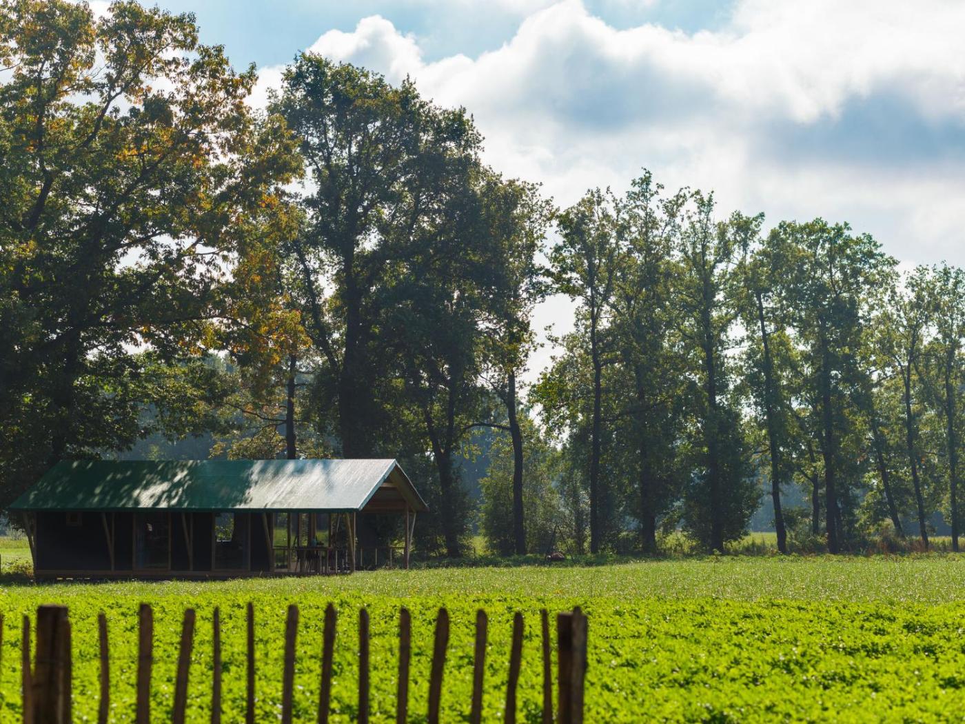 The luxury tent has 1 bedroom, a TV with cable channels, a fully equipped kitchen with a dishwasher and a microwave, a washing machine, and 1 bathroom with a shower.