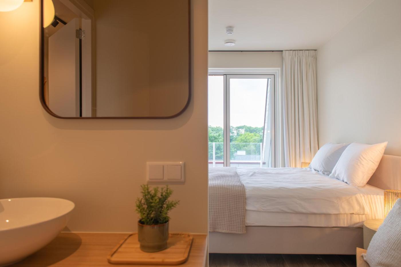 Two-Bedroom Apartment. Boasting a private entrance, this apartment features 2 bedrooms and 1 bathroom with a walk-in shower. The well-equipped kitchen has a refrigerator, a dishwasher, kitchenware and a microwave. The apartment features a washing machine, soundproof walls, a tea and coffee maker, a flat-screen TV, as well as city views. The unit has 2 beds.