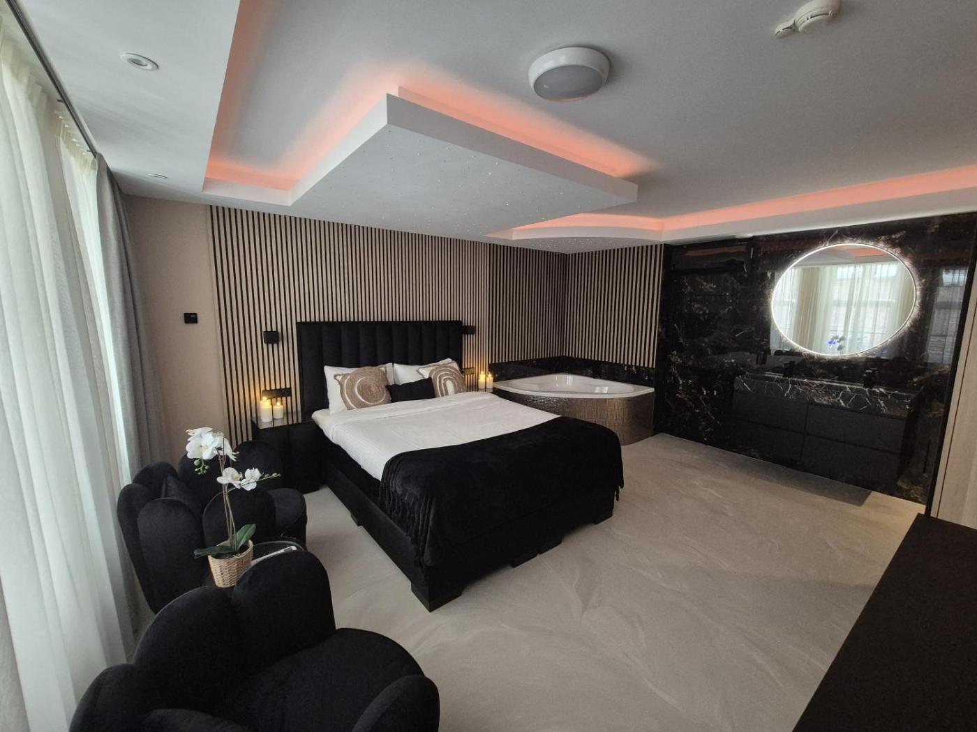 Deluxe Suite with Spa Bath. This suites special feature is the spa bath. This suite comprises 1 living room, 1 separate bedroom and 1 bathroom with a walk-in shower and free toiletries. The suite features tiled floors, a seating area with a flat-screen TV with streaming services, air conditioning, a tea and coffee maker, as well as a wardrobe. The unit offers 1 bed.