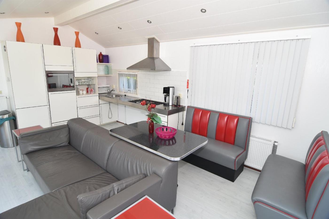 Comfort 5 person. This chalet comes with a seating area, dining area and open plan kitchen including a dishwasher and microwave. The bathroom is fitted with a shower, toilet and washbasin. There is 1 double room and 1 triple room. The sliding door provides access to a furnished terrace. Private parking is located next to the chalet. Please note that the layout and decoration per chalet may slightly differ than mentioned above. ;