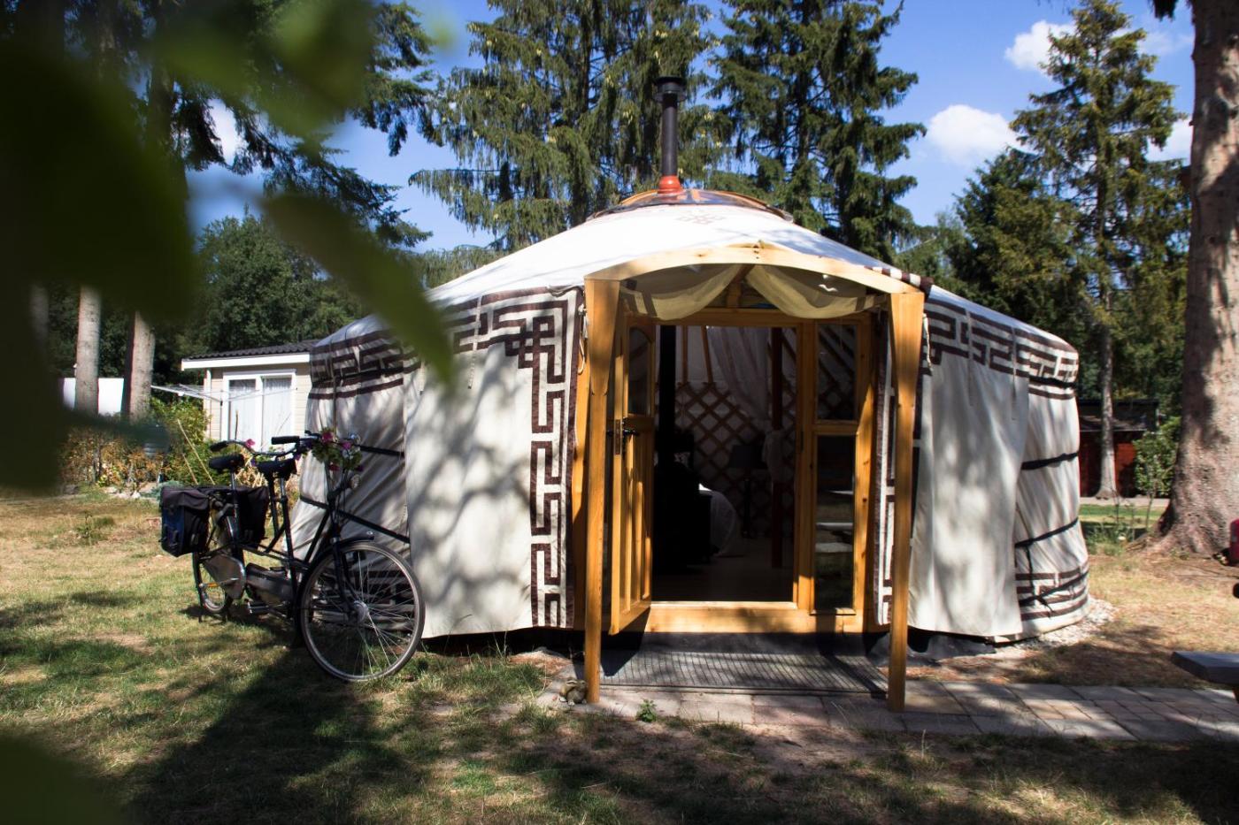 Yurt. This tent has a double bed, wood stove, small sitting area, dining table, refrigerator and washbasin. There is a picnic table outside in the garden. The kitchen and shower facilities are shared. ;