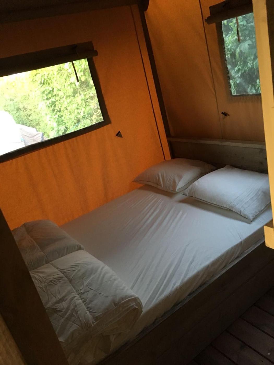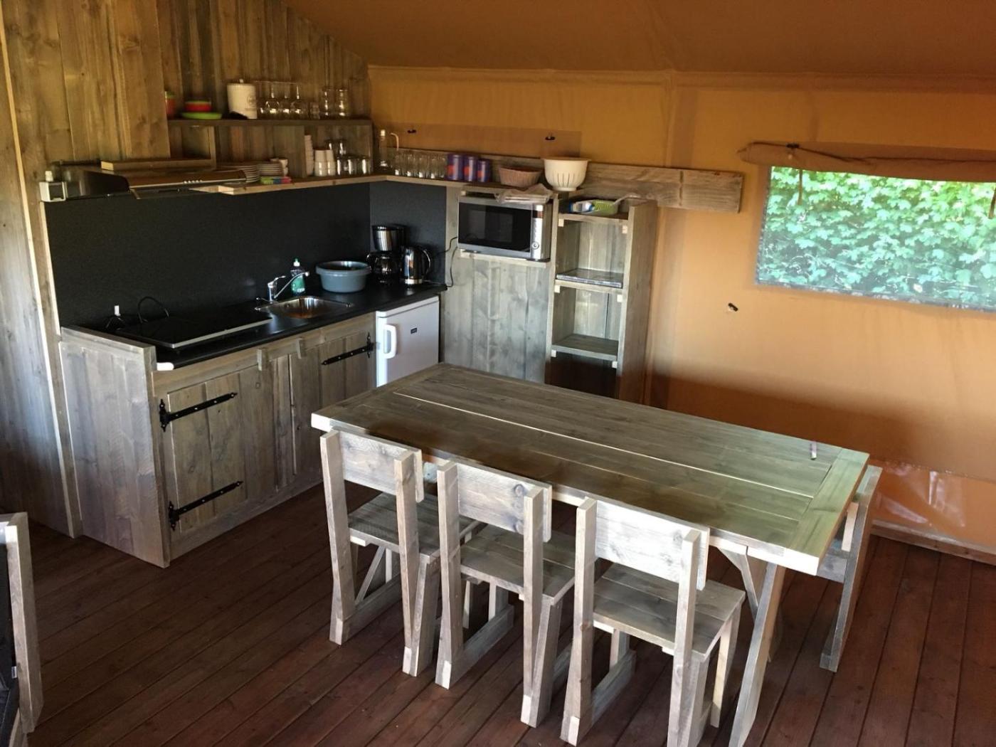 Tent. Guests will find a stovetop, a refrigerator, kitchenware and a microwave in the kitchen. The tent also has a barbecue. This tent features a shared bathroom, a coffee machine, a dining area as well as a terrace. The unit offers 5 beds.